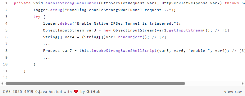 The vulnerable code allows attackers to send malicious serialized Java objects to the /deployment-rpc/enableStrongSwanTunnel endpoint, where user-controlled input is passed directly to system commands executed via sudo /opt/CSCOcpm/bin/configureStrongSwan.sh.