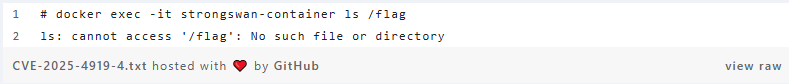 The exploitation path leads through a chain of function calls that ultimately execute attacker-controlled commands within a Docker container named strongswan-container.