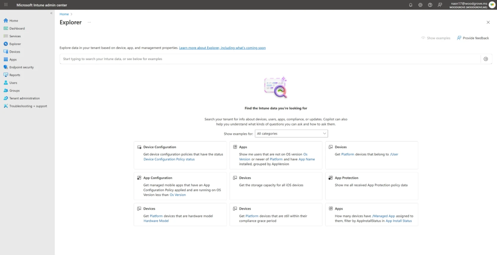 The new dedicated page in the Intune admin center allows administrators to use natural language queries to extract insights across multiple domains, including devices, apps, security policies, users, compliance data, and app configurations.