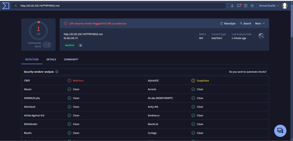 Upon visiting a related IP (hxxp://62.60.226.74/PTRFHDGS.msi), an automatic download of rh_0.9.0.exe is triggered. This executable closely matches previously documented Rhadamanthys Stealer samples.