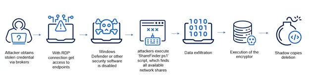 Before encryption, attackers execute reconnaissance using the ‘ShareFinder.ps1’ script to identify network shares, then employ WinRAR for file compression and FileZilla for data exfiltration to command-and-control servers.