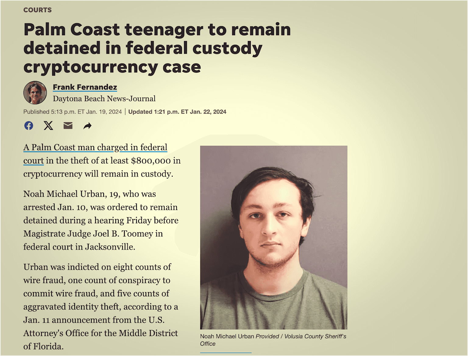 Article on Palm Coast teenager Noah Michael Urban detained for $800,000 cryptocurrency theft and conspiracy charges
